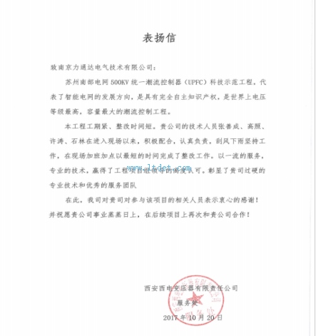 10月20日,南京力通達(dá)電氣技術(shù)有限公司收到西安西電變壓器有限責(zé)任公司表?yè)P(yáng)信,對(duì)于蘇州南部電網(wǎng)500kV統(tǒng)一潮流控制器(UPFC)科技示范工程確保工期節(jié)點(diǎn),堅(jiān)持品質(zhì)履約給予高度贊譽(yù)。